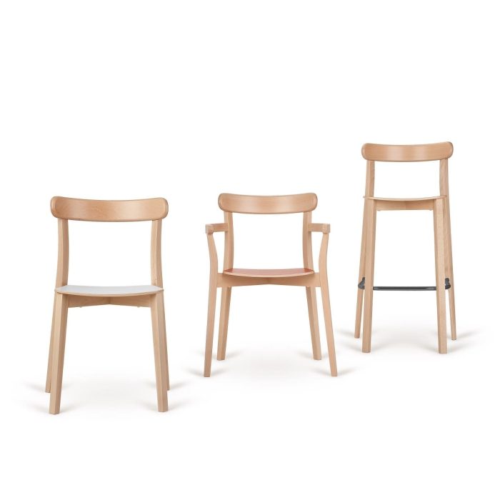 Icho je vitek, nepretenciozen in univerzalen stol. Lahkotnost njegove konstrukcije ustreza vizualni lahkotnosti, kljub temu stol zaznamujeta robustno naslonjalo in stabilen sedež. Noge, ki se rahlo upognejo čez konture stola, so značilen in prefinjen element njegove zasnove. Barski stol je mogoče zlagati (do 4 kosov).