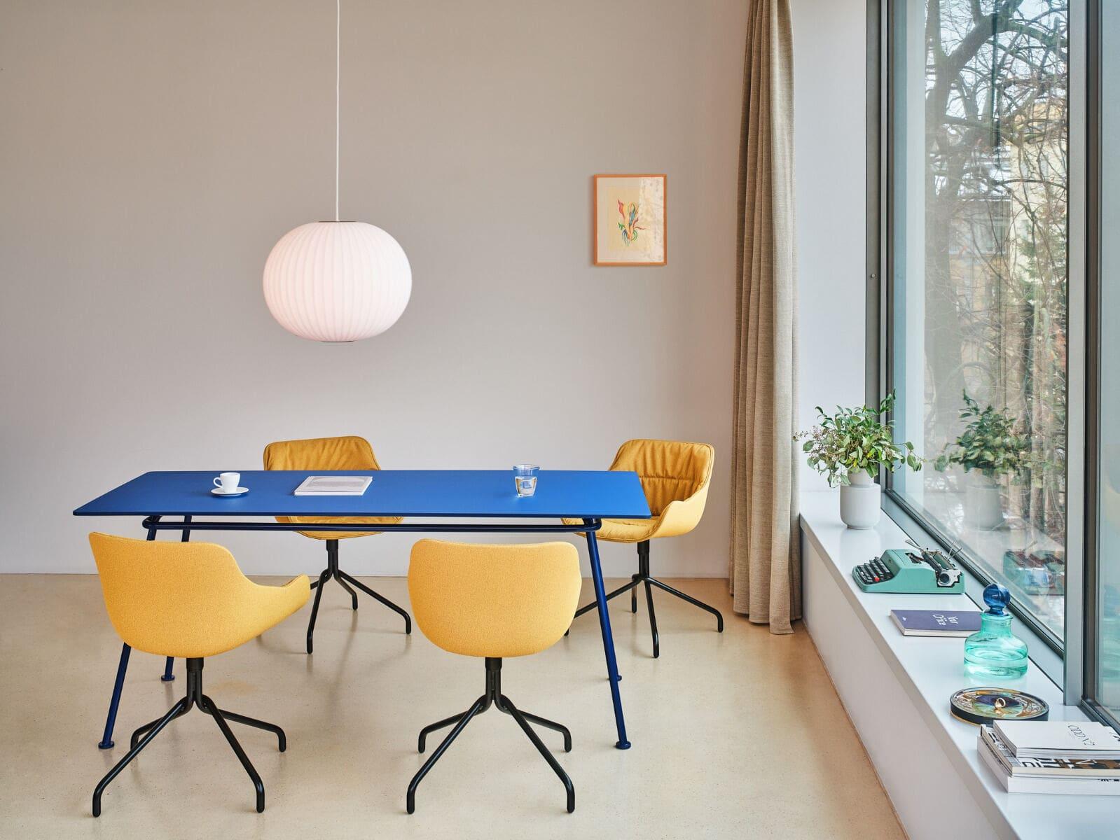 Studio Form Us With Love je oblikoval mize New School, ki dopolnjujejo zbirko stolov. Oblikovalci so si izposodili upognjen cevasti okvir stolov in ga dopolnili s serijo miznih plošč različnih oblik in velikosti. Enostavne oblike in intenzivne barve miz so bile ustvarjene z mislijo na interier in jih je mogoče prilagoditi različnim prostorom. Maksimalno praktične, tako da jih je mogoče uporabiti v številnih kontekstih.