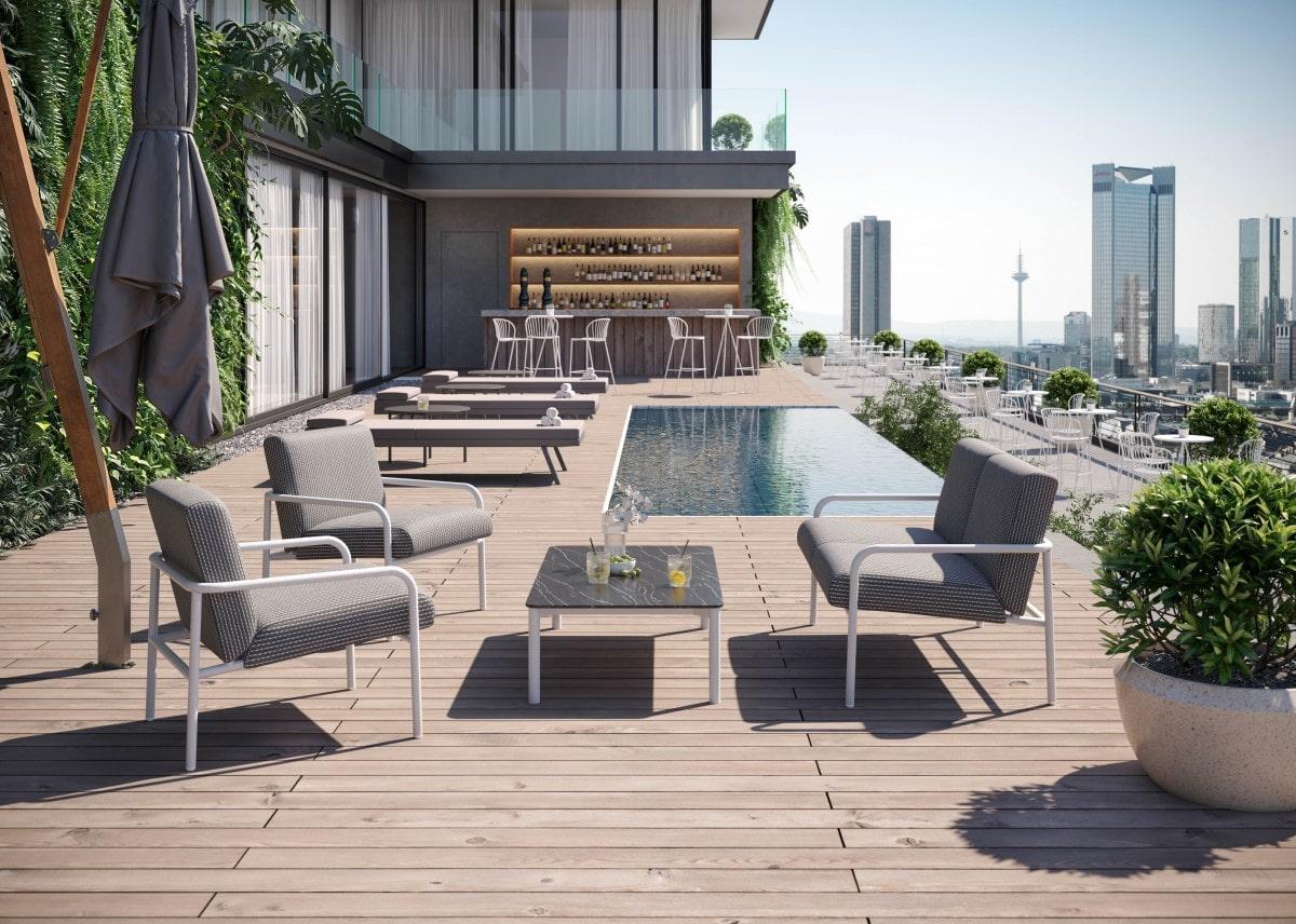 Pilar združuje sodoben dizajn in brezčasno udobje. Vsak počivalnik in kavč je izjava stila, povabilo k uživanju na prostem s pridihom elegance. Trden in prefinjen aluminijast okvir počiva na štirih nogah, ki zagotavljajo stabilnost in odpornost. Mehke in prijetne blazine so srce Pilarjevega udobja, zasnovane tako, da jih je mogoče enostavno odstraniti in očistiti, kar vedno zagotavlja edinstveno sproščujočo izkušnjo. Melanž tkanina je idealna za zunanjo uporabo: odporna je na močno sončno svetlobo in korozijo soli in klora, kar zagotavlja dolgotrajno lepoto.